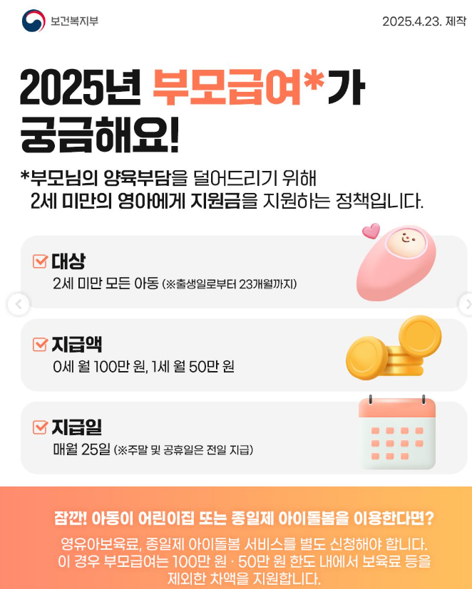 💬부모급여로 아이와 함께 행복한 가정이 될 수 있도록 영아가족에게 든든한 힘이 되어드리겠습니다.
