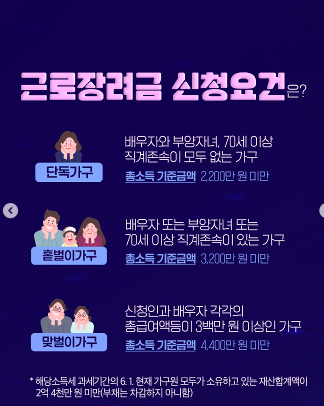 📍신청요건 : 2024년에 근로소득, 사업소득 또는 종교인소득이 있는 거주자로서 소득·재산 등 요건을 충족한 자